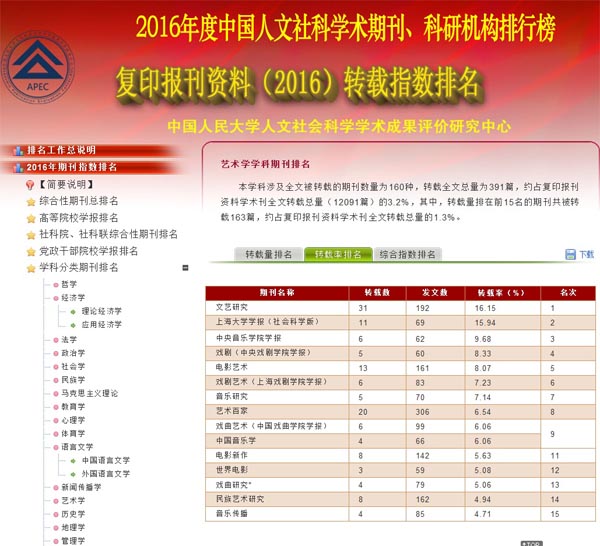 由我校主办、我院承办的学术期刊《音乐传播》在中国人民大学人文社会科学学术成果评价研究中心的艺术类学术期刊2016年度转载率排名中获得第15名,成为唯一进入该转载率榜单的音乐类非核心期刊。