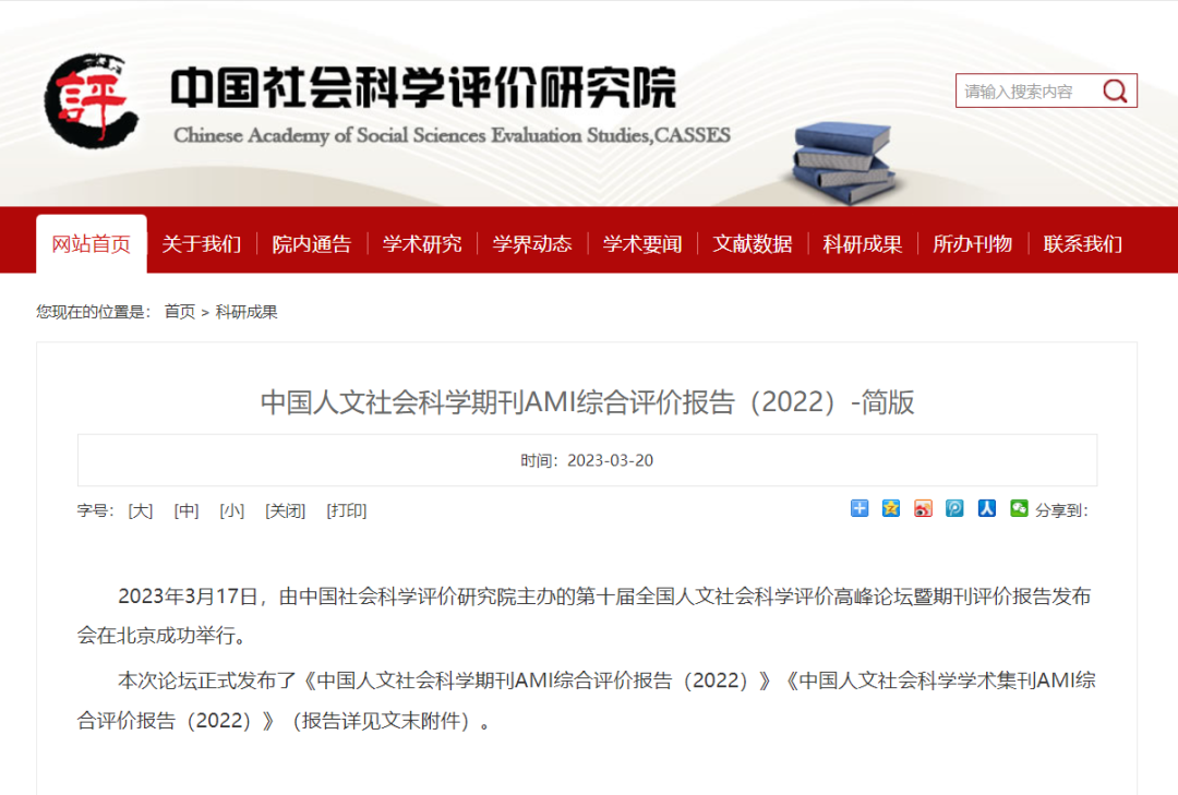 由中国社会科学评价研究院组织评定并进行报告发布。从2014年开始,该院每四年组织一次期刊评价,迄今已经开展了三轮评价并发布了三版评价报告。本轮评价根据《中国人文社会科学期刊 AMI 综合评价指标体系(2022 版)》实施,该体系由3个一级指标(吸引力、管理力、影响力)、13个二级指标和31个三级指标构成;数据来源包括评价院自建和自采数据、第三方数据,以及期刊编辑部自评数据。