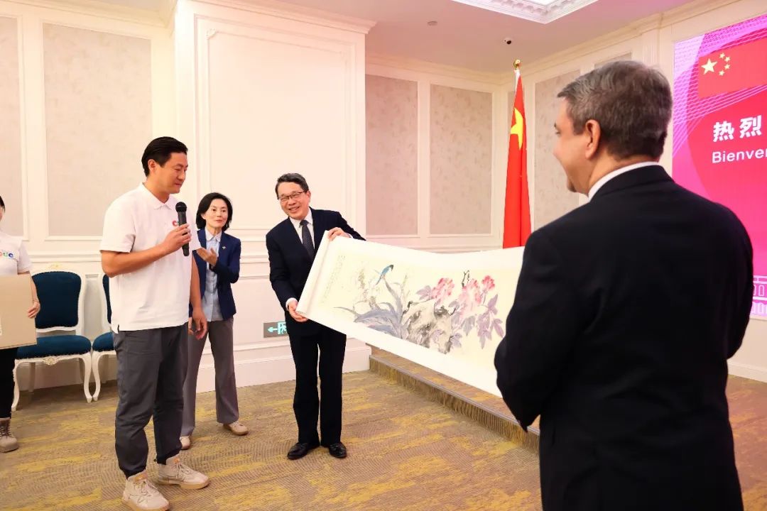 华体会娱乐场 中国画研究院首届博士班同学将集体创作的《美美与共、美人与美》画作赠送给Walter Baluja García部长,象征着中古越来越紧密的教育文化交流促进两国文明互鉴、加深相互了解。张树庭代表学校向古巴代表团赠礼。