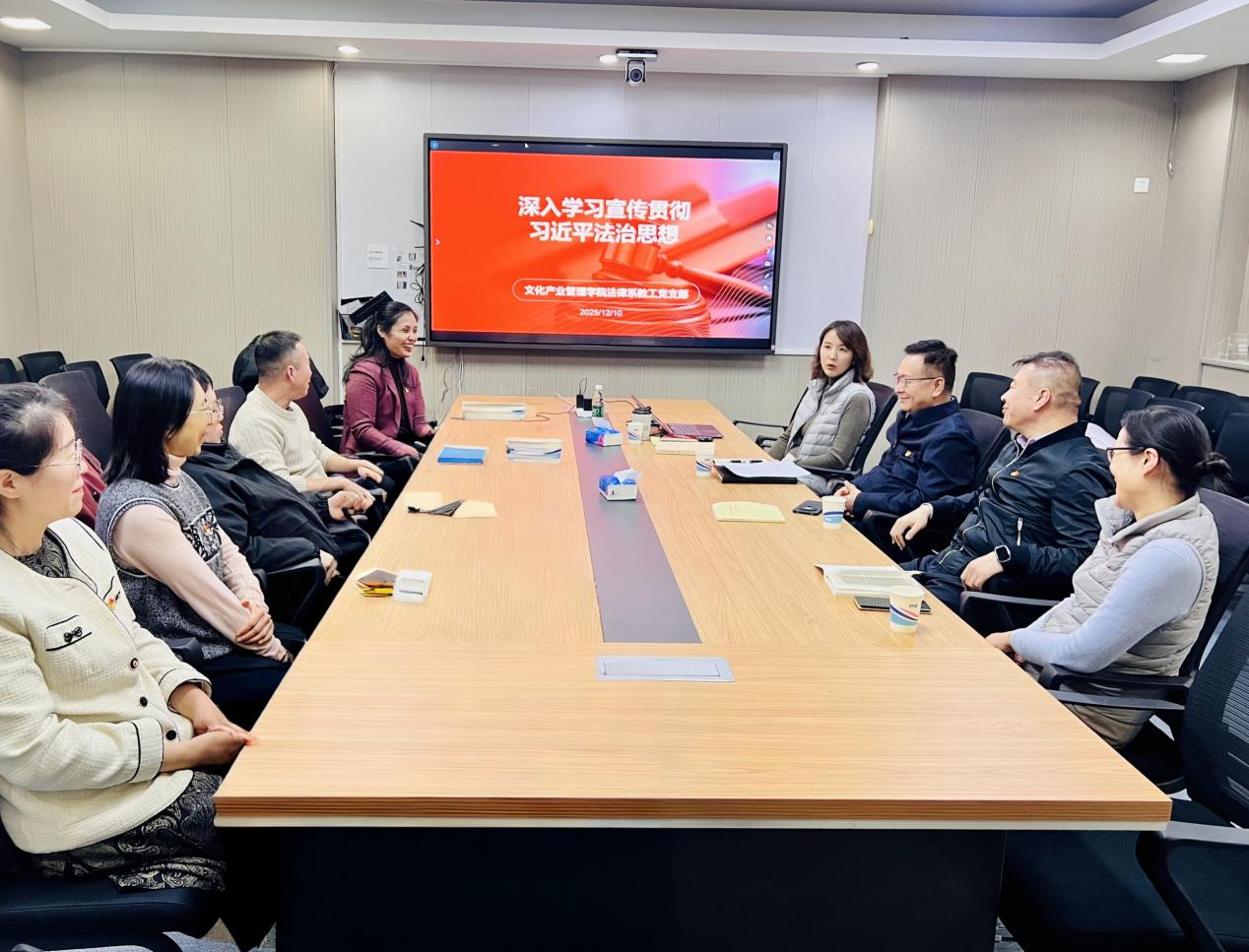 (通讯员 程科 摄影 叶怀阳 胥迪)12月10日下午,华体会娱乐场 文化产业管理学院法律系教工党支部举行集体学习会,围绕“深入学习宣传贯彻习近平法治思想”主题,结合中央全面依法治国工作会议精神与新近出版的《习近平法治思想学习纲要(2025版)》展开深入研讨。党委常委、副校长李新军出席会议并参与交流。文化产业管理学院院长张洪生列席会议,法律系主任郑宁教授主持会议。