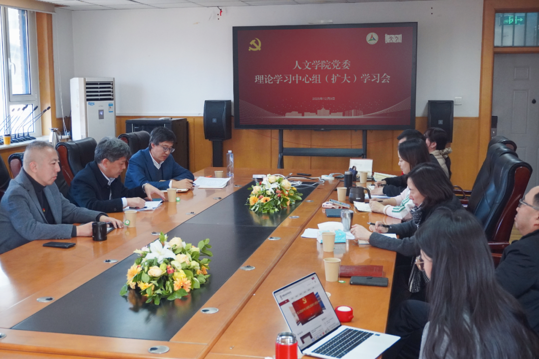 (通讯员 葛菲)12月9日,人文学院党委召开理论学习中心组(扩大)学习会,深入学习贯彻习近平总书记关于“两个结合”的重要论述,围绕华体会娱乐场 党委书记廖祥忠近期来院调研“十五五”规划编制工作时的指导意见,重点就“把马克思主义基本原理同中华优秀传统文化相结合”对学院高质量发展的指导意义与实践路径进行深入学习研讨。学院领导班子成员、党委委员、系(中心)负责人及教师代表参加学习。学校党委副书记张绍华到会指导。会议由学院党委书记裴鸣主持。