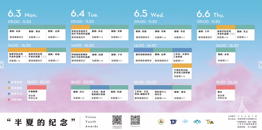 The Vision Youth Awards is an original student film festival hosted by School of Television, Communication University of China. Taking the image as a carrier, the Festival insists on the "social vision" and "youth perspective" as the selection criteria, and build a professional and high-quality communication platform for young people. Excellent film works for screening will be selected from China International New Media Short Film Festival (CSFF), the Vision Youth Awards, Festival de Cine de Bogotá and other film festivals.