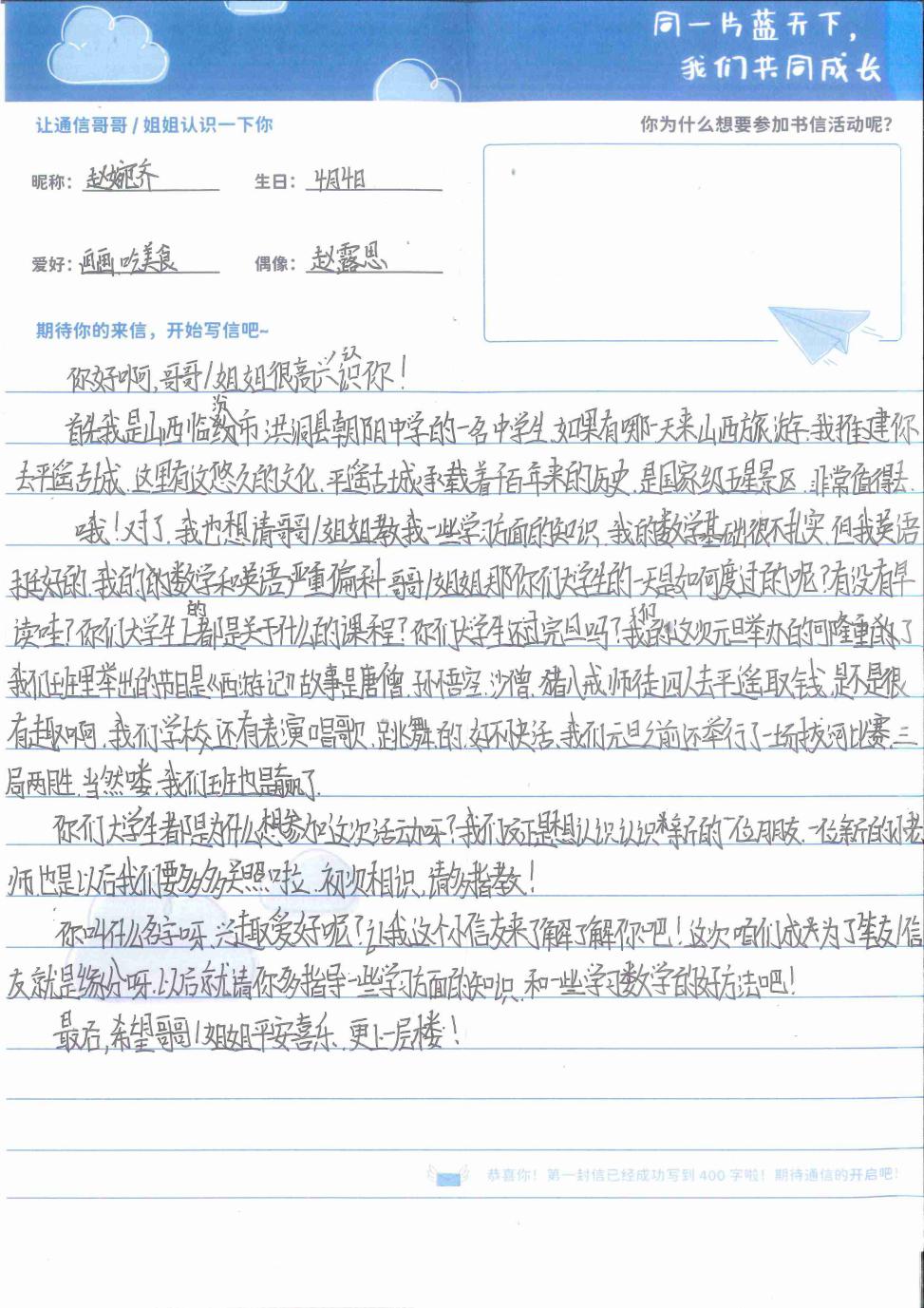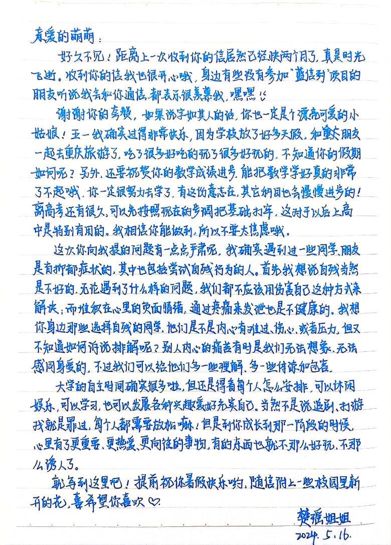 My own experience as a Blue Letter ambassador has been equally meaningful. I was paired with a girl named Zhao Wanqi. From the very beginning, our letters were filled with curiosity and trust. Zhao often shared with me her life in the countryside, her daily routines, and the things she dreamed of doing in the future. Over time, she started to confide more about her feelings—her worries about studies, her small joys with friends, and her thoughts about her family.