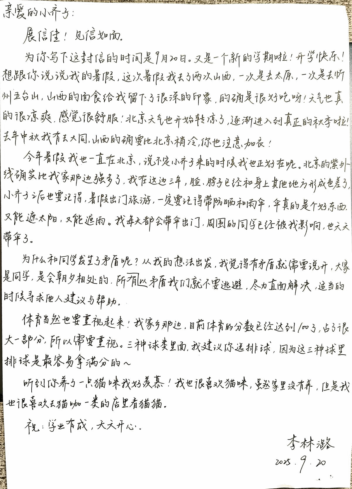 Every month, they exchange one letter, sharing their daily lives and including photos of their surroundings. Li Mengmeng gradually opened up, first writing about hobbies and interests, and then about more personal matters, like her relationship with her younger sister or the emotions she felt about transferring schools. “Every letter carried a kind of warmth that words alone couldn’t fully express. It felt like we were growing together through these exchanges,” Ou Chuyao recalled.