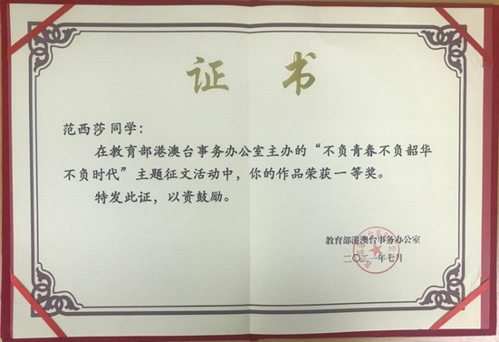 近日,我校在教育部港澳台事务办公室主办的“不负青春不负韶华不负时代”港澳台学生主题征文活动中荣获优秀组织奖,文化产业管理学院2020级香港籍本科生范西莎同学荣获一等奖。