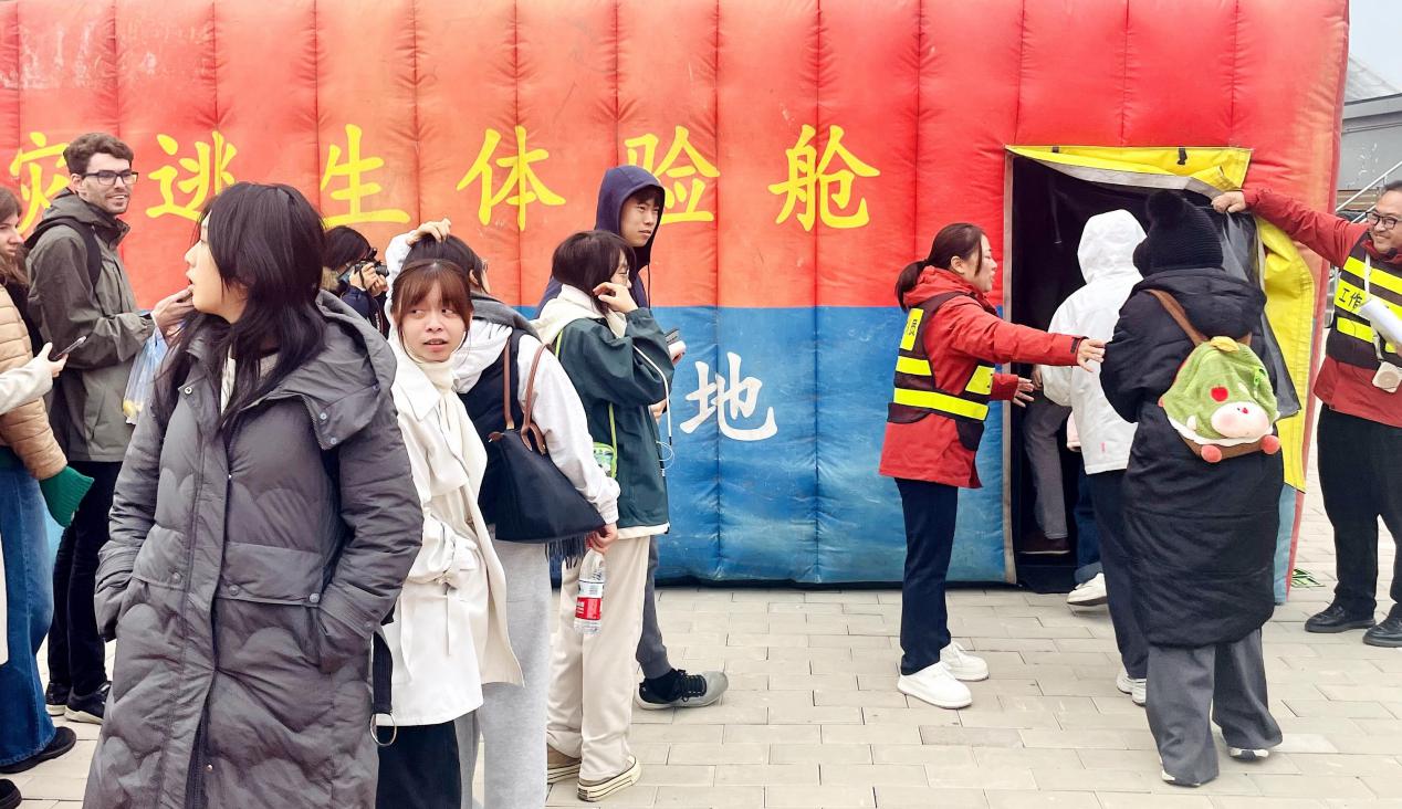 本次实训聚焦实战演练与情景体验,旨在让国际学生们在模拟的真实场景中掌握必要的自救互救以及动手技能。在实训基地,国际学生们首先认真学习了宿舍用电安全知识,了解了电磁炉、微波炉、暖风机等大功率电器的使用规范和注意事项。随后,在专业讲师的指导下,他们依次体验了多个精心设计的实训项目:学习并操作了手动报警按钮;通过VR技术沉浸式感受地震发生时的场景,学习了正确的避险姿势与疏散流程;亲身体验了火场逃生的紧张,在模拟浓烟弥漫的“热烟帐篷”中,他们了解了弯腰低姿、捂住口鼻的正确逃生要点和方法。