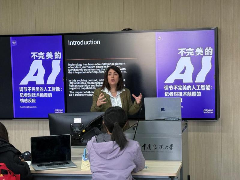 (通讯员 马汀怡摄影 任天威)2025年10月23日,密苏里大学卡罗琳娜·埃斯库德罗教授给国际传媒教育学院的学生带来“调解不完美的人工智能:记者对技术颠覆的情感反应”的主题演讲,分享她本人的最新研究成果,以及研究的过程和心得。埃斯库德罗教授通过对来自七大国家的28名记者进行深度访谈,首次系统揭示了新闻从业者在人工智能浪潮中的真实情感图景。研究发现,尽管有67%的记者对AI表示“喜欢”,但绝大多数人在表达认同的同时,都附加了一个关键转折——“但是”。这种“我喜欢,但…”的矛盾心态,成为全球新闻人的普遍写照。记者们既肯定AI的效率,但又对其伦理边界、职业不稳定性与缺乏人性化等问题保持高度警惕。 对此,埃斯库德罗教授提出“不完美AI”这一核心观点,强调记者并非技术的被动接受者,而是站在“个人技术适应”与“集体伦理担当”十字路口的积极调解者。研究指出,在阿根廷、法国等地,AI培训与记者实际需求严重脱节,加剧了从业者的焦虑与疏离。这项研究不仅展现出新闻业AI转型的现状,更开辟了一个充满张力的思考空间——在技术高速发展的时代,如何守护新闻人的主体性与专业精神,以及如何利用好AI并使其促进新闻事