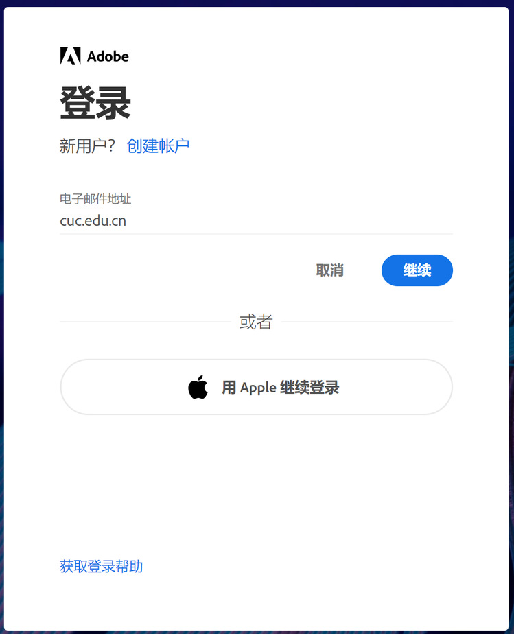 软件登录:安装后点击软件内的“登录”,在“电子邮件地址”处输入cuc.edu.cn,点击“继续”,即可跳转至学校统一身份认证登录界面,输入账号密码登录后即可使用正版Adobe软件。