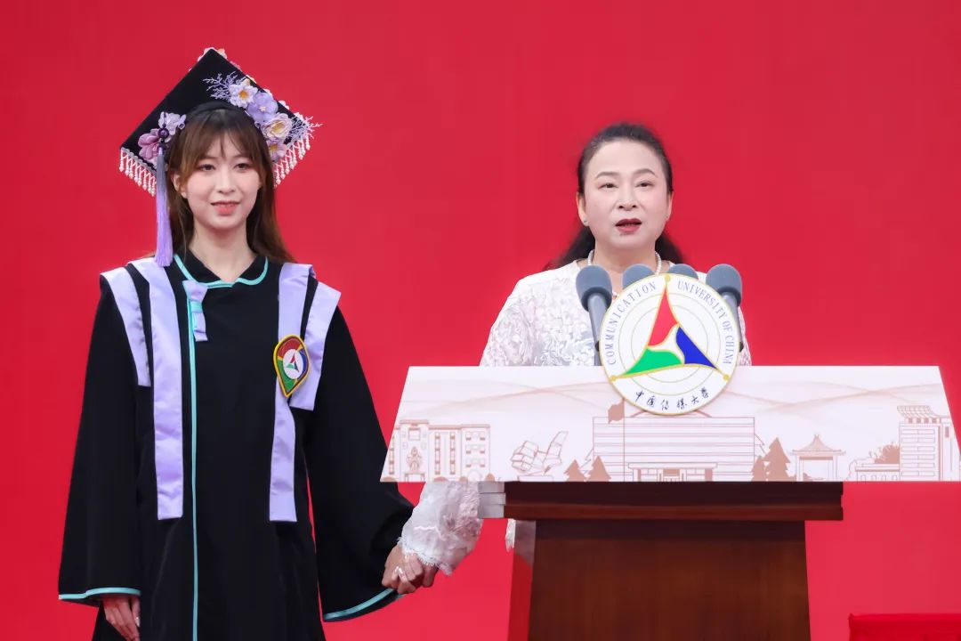 문화산업관리학원 2025년 예술관리전공 졸업생 예샤오샤오(葉嘯笑)가 어머니 친징(覃靜) 의사와 함께 무대에 올랐다. 친징은 딸의 대학 4년간의 성장변화를 공유하며 학교가 학생들에게 저력과 힘을 부여한 것에 감사하고, 학생들이 미래의 나날에서 계속 전공으로 마음을 다스리고 온도로 사람을 비추며, 초심을 잊지 않고 빛이 있는 사람이 되기를 축원했다.