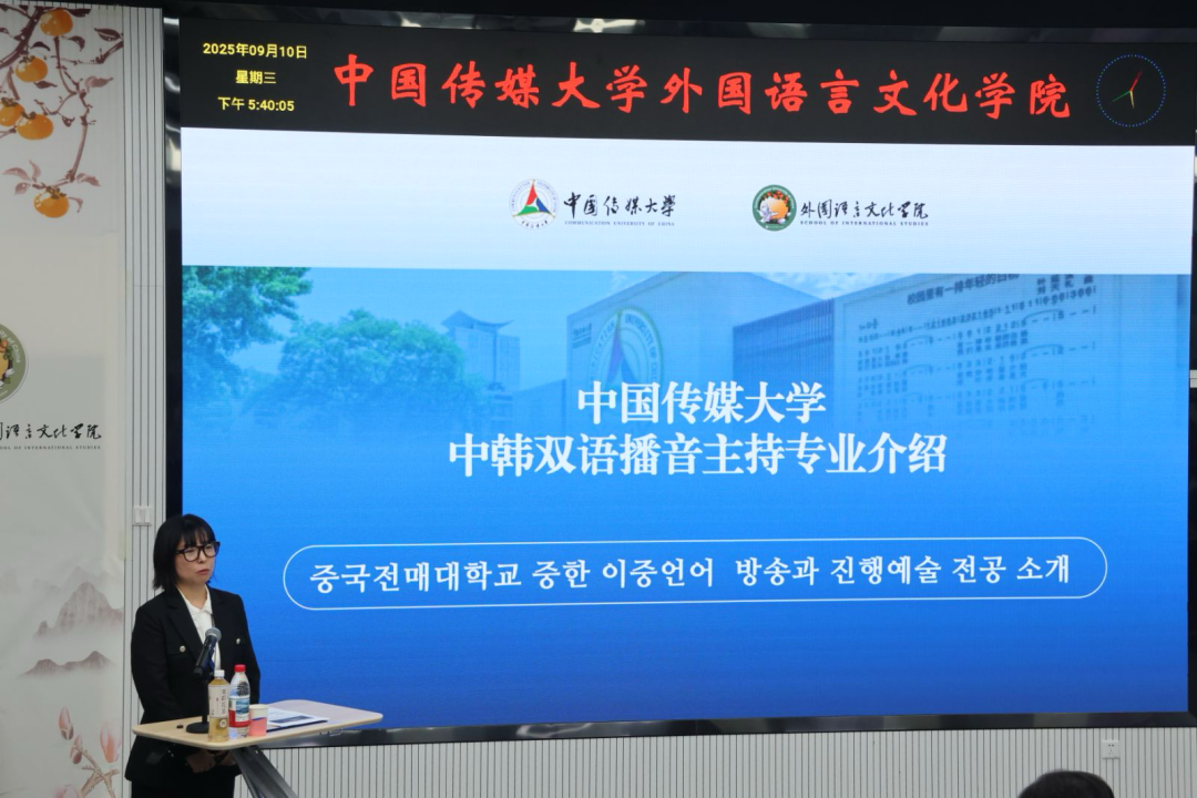 권태선 이사장의 발언이 끝난 후,아시아·아프리카어학과 학과장이자 한중 이중어 아나운서학과 전공 책임자인 정매 교수가 학교 개황,학원 구조 및 인재 양성 목표를 소개했다.특히 한중 이중어 아나운서 전공의 인재 양성 체계와 모델을 중점적으로 소개하며 학과 실무 성과를 선보였다.