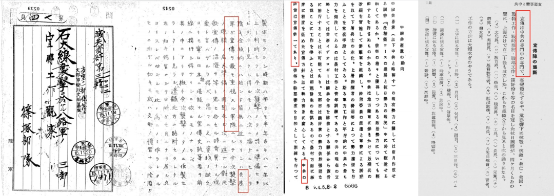일본 측은 중국공산당이 선전을 중시하고 선전에 능하다고 보았다. 1940년11월9일, 일본 침략군 기록물 ‘석태선 습격 사건 중 팔로군 선전 공작에 대한 관찰’은 “공산군은 선전을 가장 중시하는 군대”라고 지적했다. 1939년9월, 일본 외무성 정보부의 기록물 ‘중국공산당의 동향’은 “중국공산당의 정책은 선전제일주의다”라고 밝혔다. 1941년2월, 하타노 칸이치(波多野乾一)는 ‘붉은 중국의 구명’에서 “선전 방면에서 중국공산당은 전문가 중의 전문가다”라고 지적했다.