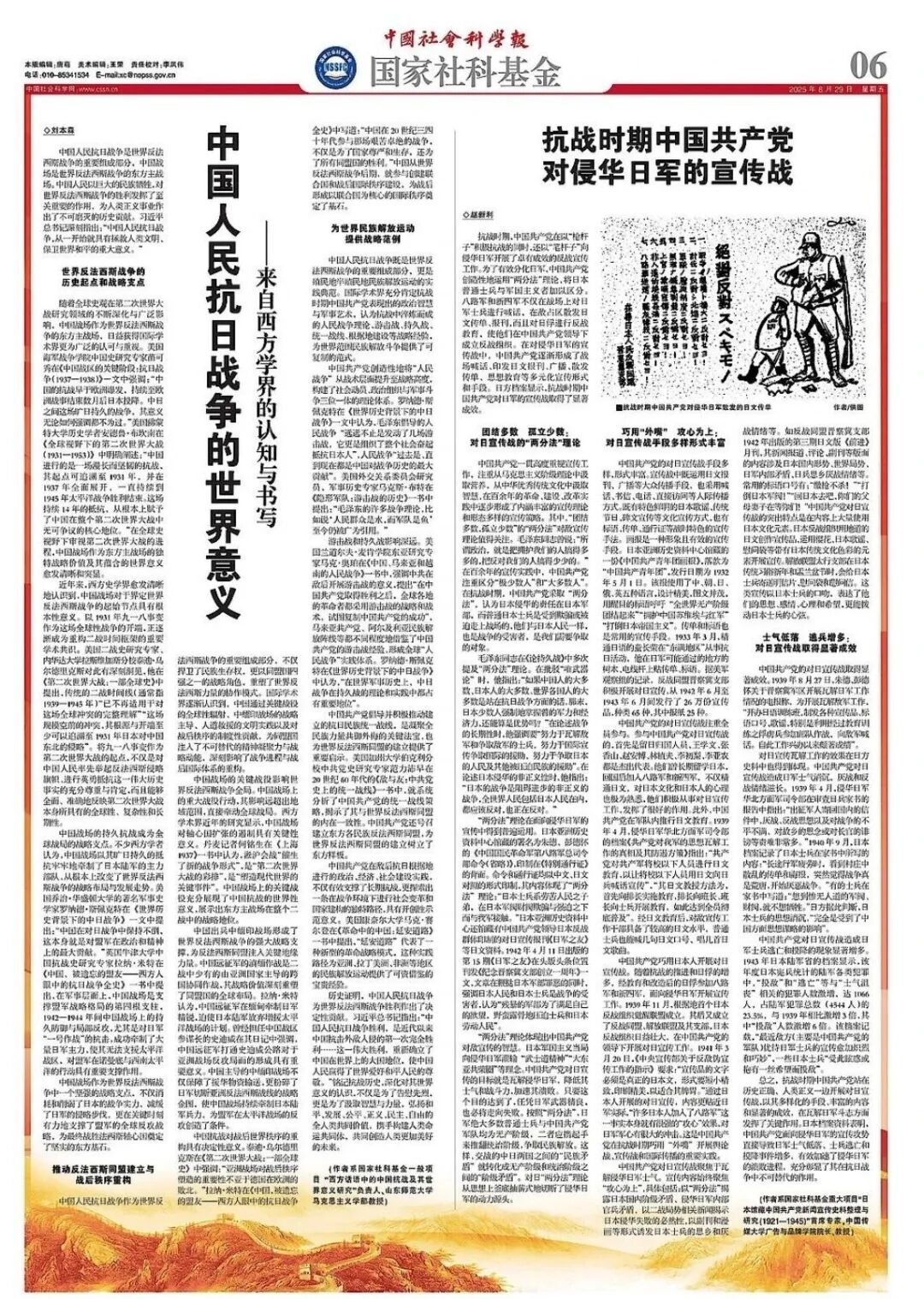 8月29일, ‘중국사회과학보’ 국가사회과학기금 특별판은 프로젝트 성과 기사 ‘항전 시기 중국공산당의 일본 침략군에 대한 선전전’을 게재했다. 이 기사는 중국공산당이 다수를 단결시키고 소수를 고립시키는 ‘양분법’ 이론의 형성을 분석하고, ‘외부의 입’을 교묘하게 활용하여 심리전을 펼친 대일 선전전의 실천을 정리했다. 일본 소장 기록물을 통해 중국공산당의 대일 선전전이 일본 침략군 내에서 사기 저하, 탈영병 증가 등의 효과를 가져왔음을 요약하며, 항전에서 중국공산당의 대체 불가능한 역사적 공헌을 명확히 보여주었다.