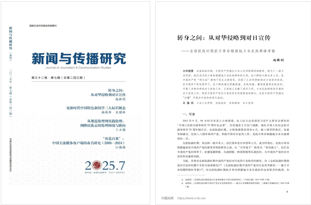 2025년 제7기 ‘뉴스 및 커뮤니케이션 연구’에는 프로젝트 성과 논문 ‘전환: 대중국 침략에서 대일본 선전으로’가 게재되었다. 이 논문은 전면 항전 시기 중국공산당이 일본 포로들을 교육하고 변화시켰다고 지적했다. 이들 대부분은 노동자·농민 출신으로, 중국공산당의 ‘양분법’ 영향 아래 입장을 전환하여 대중국 침략에서 대일본 선전으로의 전환을 실현했다. 중국공산당의 지도 아래 다양한 대일본 선전 활동을 전개한 것은 ‘외부의 입’을 통한 대외 선전의 위대한 시도였다.