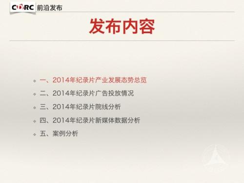 本次发布的数据涵盖传统媒体及网络媒体,内容包括纪录片产业整体产制播分析、广告收益分析、纪录院线分析、新媒体纪录片分析、个案分析多方面内容,对中国纪录片2014年的整体表现以及2015年第一季度发展情况进行了勾勒和分析,呈现出一个数字化、清晰化的2014中国纪录片整体形象。整体而言,2014年中国纪录片受到来自多方利好因素的影响,在产量、制作量、投资、院线等方面均获得较大幅增长,亮点颇多。在播出总量、首播量、制作量等方面出现倍数量级增长;广告收益方面出现一些亮点;受众年轻化倾向明显;政策推手效果开始全面体现。