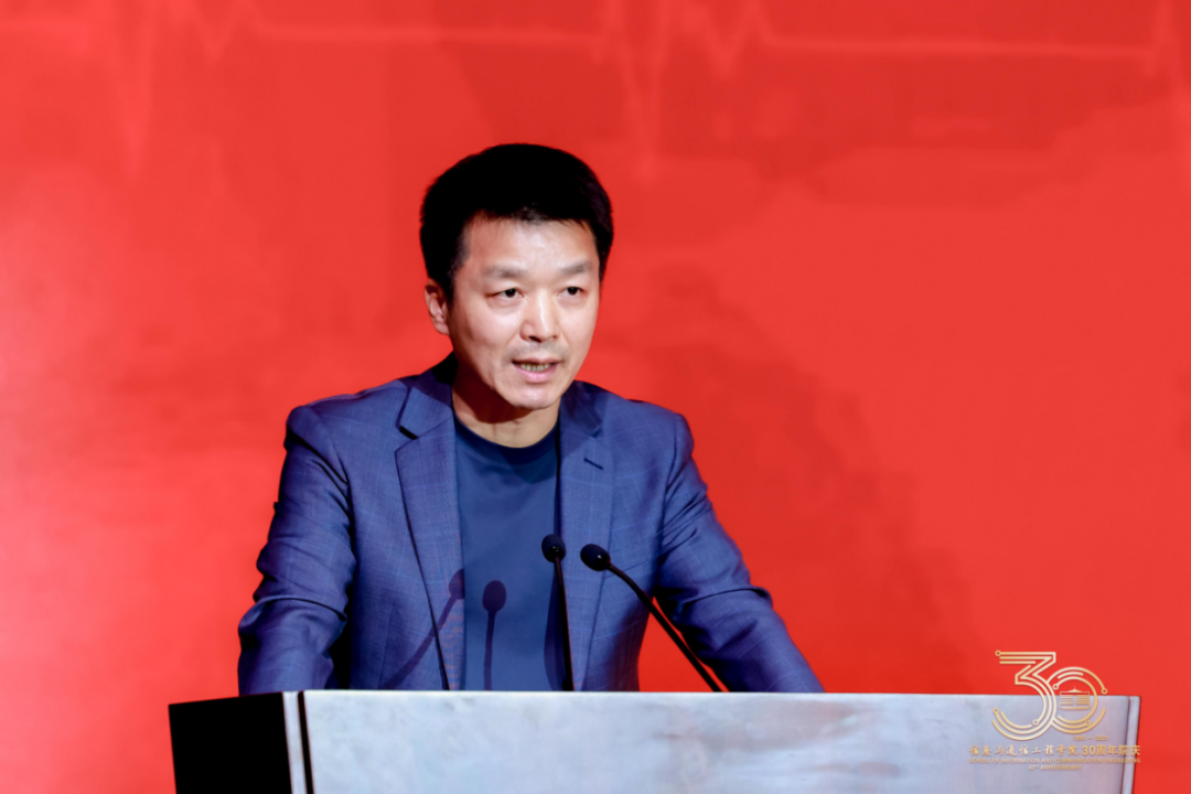 信息与通信工程学院院长金立标致辞。金立标首先代表学院向莅临大会现场的各位领导、嘉宾表示最热烈的欢迎!向为学院开拓基业、倾注心血的历任领导、离退休老同志致以最崇高的敬意!向学院全体师生员工,以及从五湖四海荣归母校的各位校友们,致以最亲切的问候!向长期以来关心和支持学院发展的社会各界朋友、合作伙伴,表示最衷心的感谢!