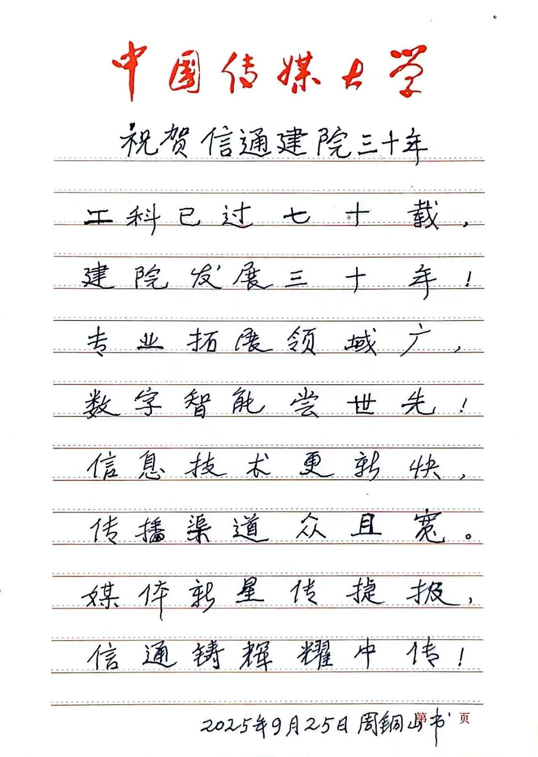 原北京广播学院周铜山副院长为学院30周年题贺词。