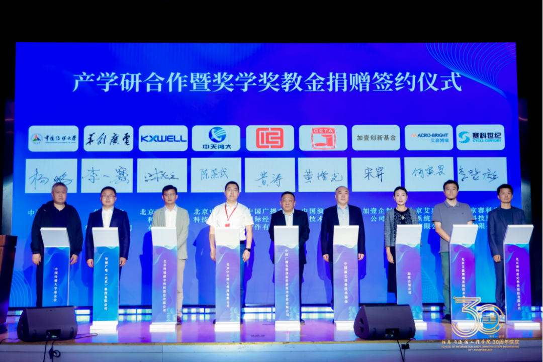 学院践行“校企携手,共筑育人高地”理念,积极与行业单位紧密携手,构建“科技赋能教育、教育反哺产业”的良性生态。校基金会秘书长杨鹏与华创广电(北京)科技有限公司副总裁李一赛、北京中天鸿大科技有限公司总经理陈燕武、加壹企划公司委托代表宋昇女士、中国广播电视国际经济技术合作有限公司党委副书记、纪委书记黄涛、北京艾嘉博瑞系统技术有限公司副总经理何寅畏、中国演艺设备技术协会秘书长黄增光、北京赛科世纪科技股份有限公司董事长兼总经理李登彪、北京科旭威尔科技股份有限公司董事长谢先运签署奖学奖教金协议。