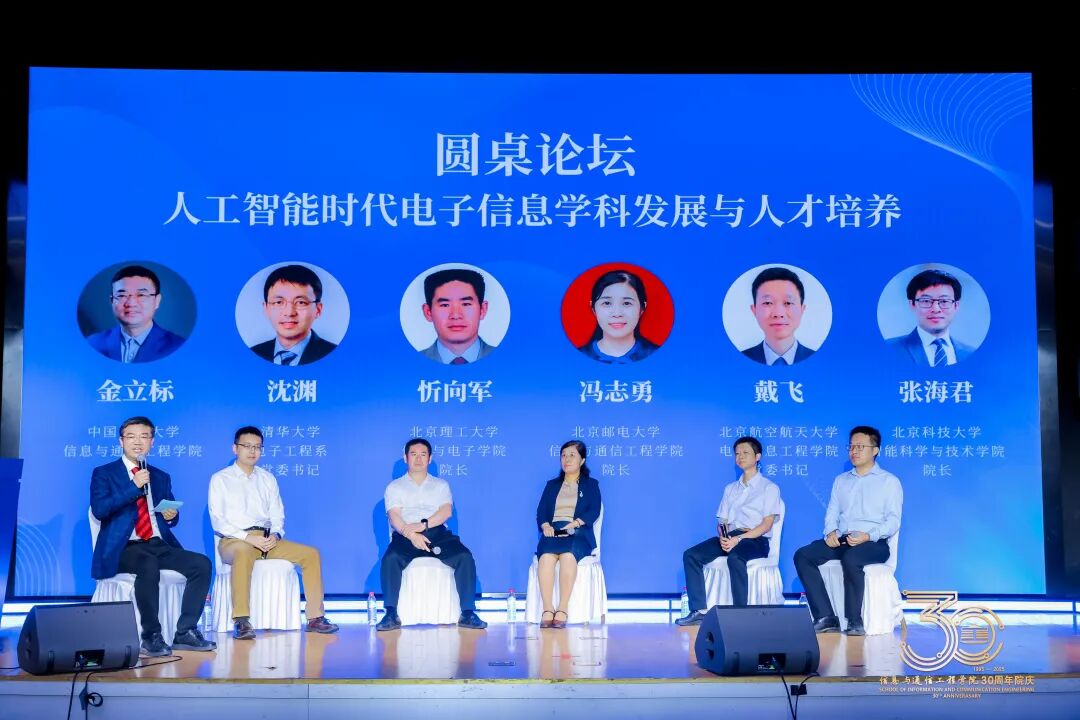 站在三十周年的节点,既回望过往,更聚焦当下、共探前沿。金立标院长与北京理工大学信息与电子学院院长忻向军、北京邮电大学信息与通信工程学院院长冯志勇、北京航空航天大学电子信息工程学院党委书记戴飞、清华大学电子工程系党委书记沈渊、北京科技大学智能科学与技术学院院长张海君围绕“人工智能时代电子信息学科发展与人才培养”主题在大会现场呈现了一场精彩的圆桌论坛。