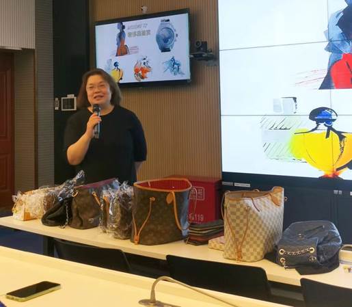 讲座中,陈静宜主要介绍了路易威登(LV)品牌箱包的真品鉴定方法,并通过企业携带的几十款奢侈品箱包进行实例介绍及真品、仿品的对比讲解。本活动还设置了问答环节,由现场听课的老师和同学鉴别产品的真伪,积极参与问答的老师同学还获得了华夏典当行准备的奢侈品衍生精美礼物一份。