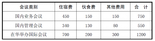 6、对会议进行分类管理。分业务会议、管理会议和国际会议,对各类会议制定不同的最高定额标准。国内业务会议每日额度不得超过750元,国内管理会议定额为550元,国际会议为1200元。