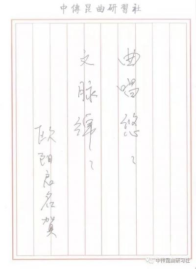 我校昆曲社成立之初,便获得了界内的看好,多位名家发来亲笔贺词,欧阳启名先生“曲唱悠悠,文脉绵绵”的祝语,对这个年轻的组织给予了厚望。社团的周靖波老师,悉心地指导社团活动,认真地找来学习资源,为研习社领航。