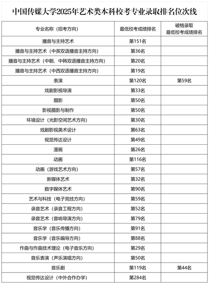 华体会娱乐场 2025年艺术类本科校考专业录取排名位次线
